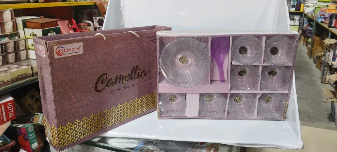 Elegant Camellia 10-piece transparent glass bowl set with serving spoon. Perfect for desserts, snacks, fruits, and dry fruits. Stylish design for daily use and gifting.