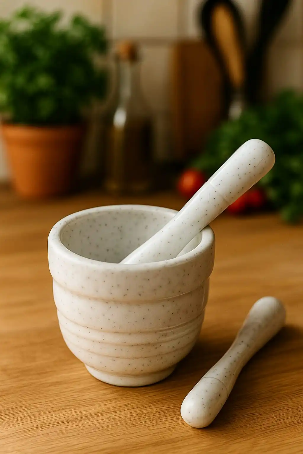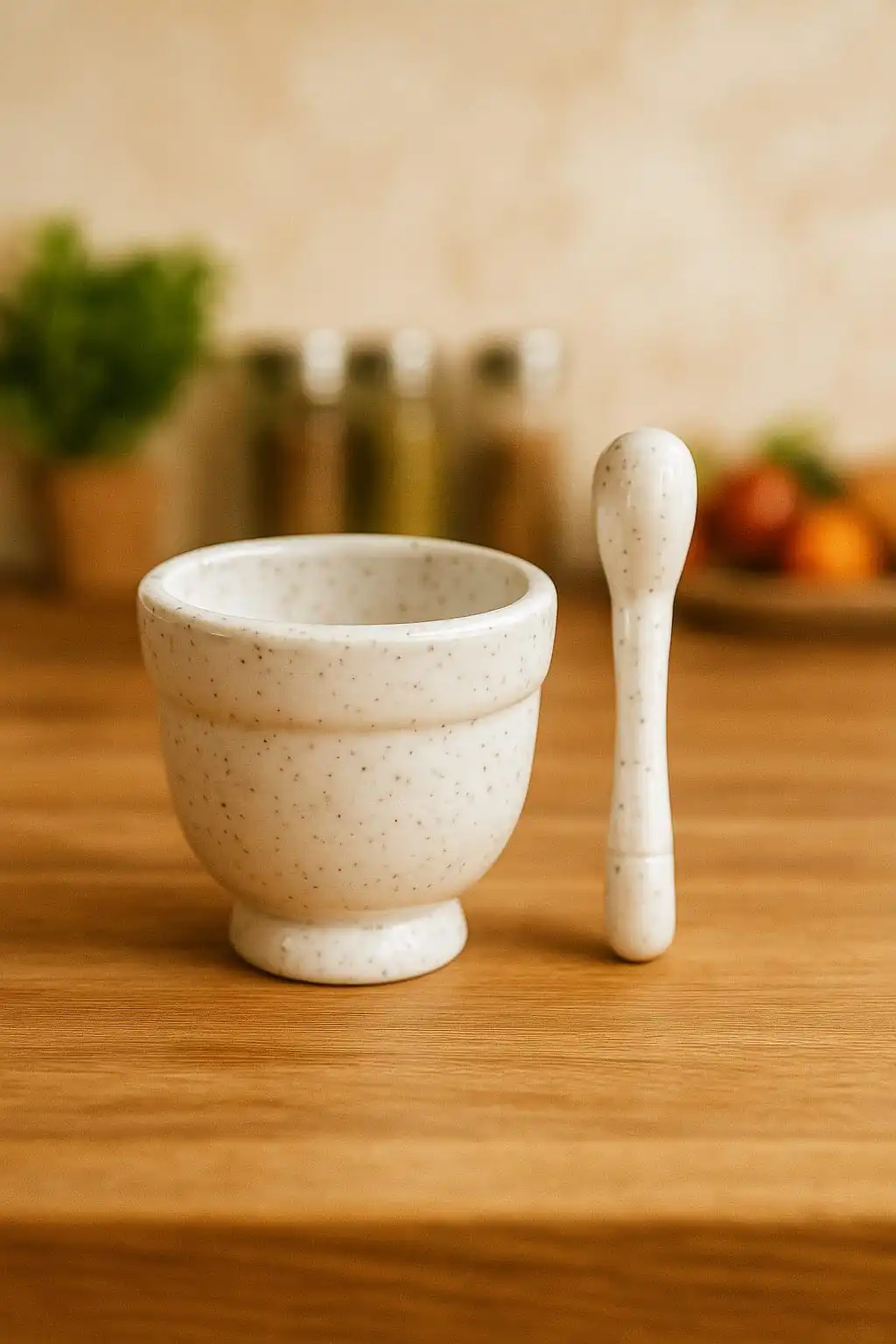 The heavy-duty mortar provides a strong base while the smooth, perfectly shaped pestle ensures easy crushing and grinding without slipping. Its natural marble texture helps extract maximum flavor and aroma from ingredients, making it ideal for preparing fresh spice blends and traditional recipes.