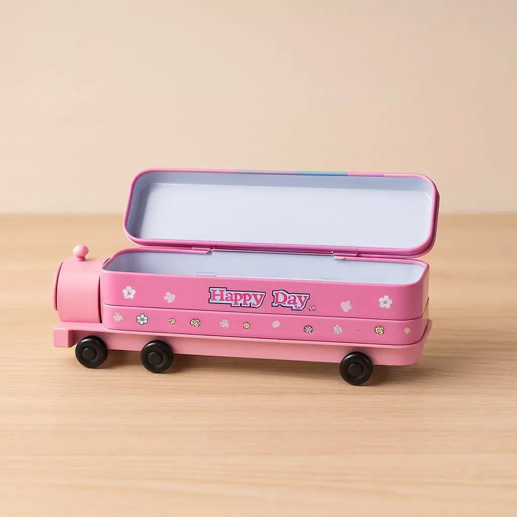 Cute pink train-shaped pencil box for kids, perfect for storing pencils, erasers, and other stationery items.