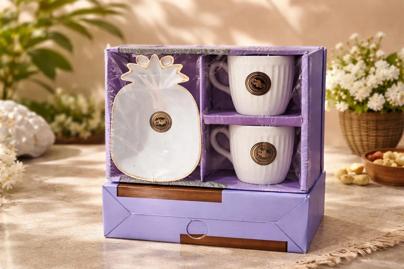 Add elegance to your tea-time with this Premium White Crockery Set. This beautiful set includes 2 stylish coffee mugs and 1 designer bowl, perfect for serving tea, coffee, snacks, or dry fruits. The classy white finish with golden detailing and unique leaf-shaped design makes it a luxurious addition to your kitchen.