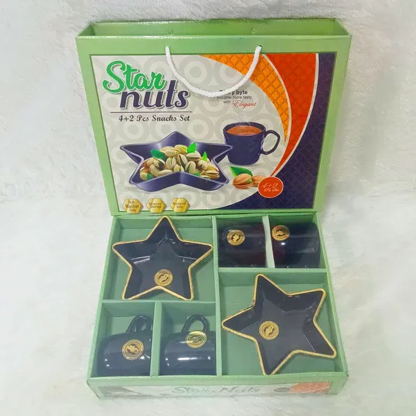 The Star Nuts Star-Shaped Snack Bowl & Cup Set (4+2 Pcs) is a premium serveware set designed for stylish snacking and entertaining. Featuring a modern star-shaped design with a glossy black finish and golden rim, this set adds elegance to any table setting. Ideal for serving dry fruits, nuts, snacks, tea, or coffee, it is suitable for everyday use, festive occasions, and gifting. The sturdy build ensures durability, while the compact boxed packaging makes it easy to store and present as a gift.