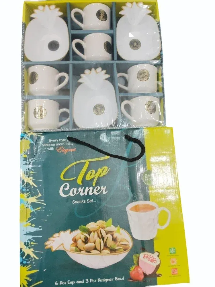 The Top Corner Pineapple Design Snack Bowl & Tea Cup Set (9 Pcs) brings a fresh and elegant look to your serving collection. Crafted with a glossy white finish and a unique pineapple-inspired design, this set is ideal for serving snacks, dry fruits, desserts, tea, or coffee. Its modern yet classy appearance makes it suitable for daily use, festive occasions, and gifting. Made from high-quality ceramic material, it is durable, easy to clean, and enhances any table setting.